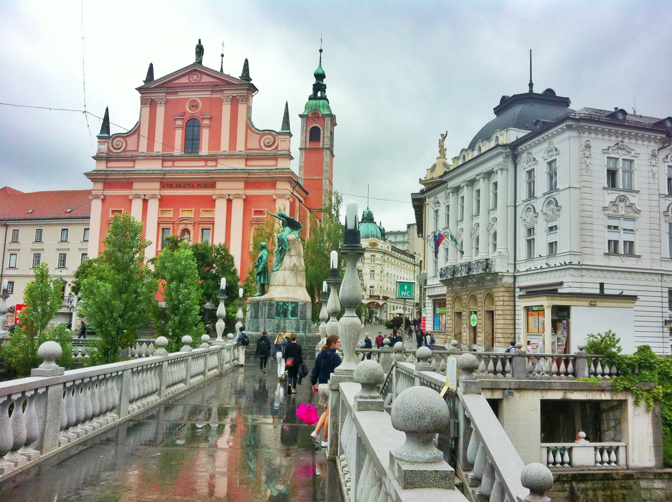 I took the bus from Trieste, Italy to Ljubijana, which took about two hours. I got pretty unlucky with the weather, especially considering I was there in mid-August. It was raining during the bus ride, and the visibility wasn’t great, but I could still tell it was absolutely stunning landscapes. We arrived into the capital city, Ljubijana, and I walked with a Portuguese couple to their hostel to see if they had any beds available. We booked our rooms, and the Portuguese couple and myself began exploring the city. It had stopped raining during the day, which was great considering the people at the hostel said it had been pretty rainy for the past week.