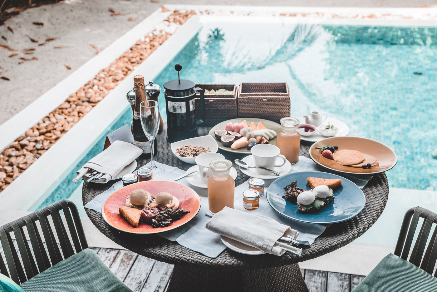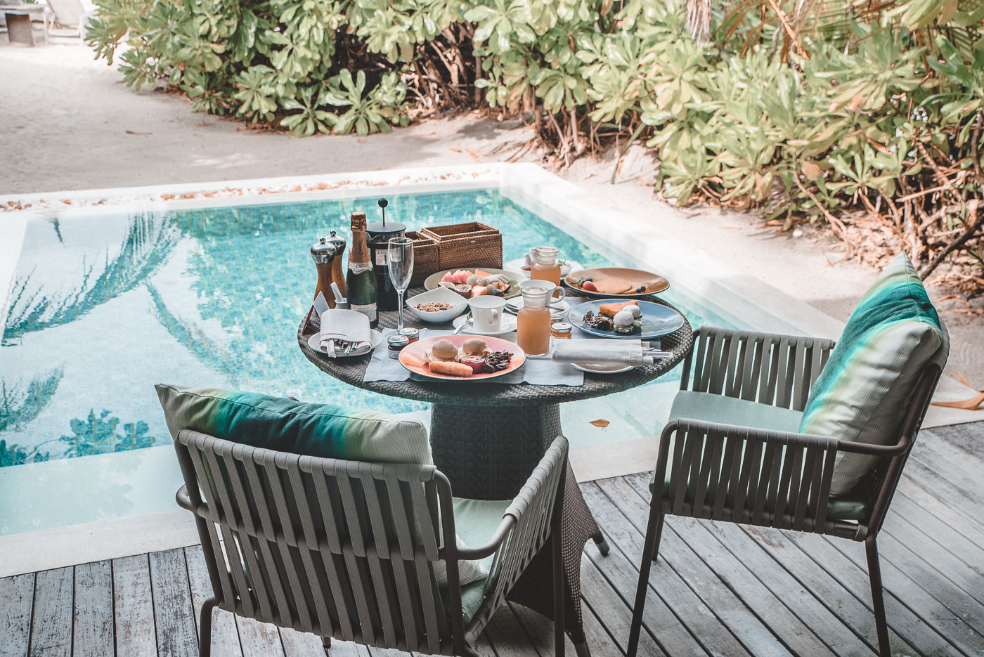Just kidding.  We actually already had this planned, and ordered it the night before!  Kanhura offers a ton of different in villa breakfast options, and it was such an awesome experience!  They literally think of everything, and set-up a massive & delicious spread outside by our pool.