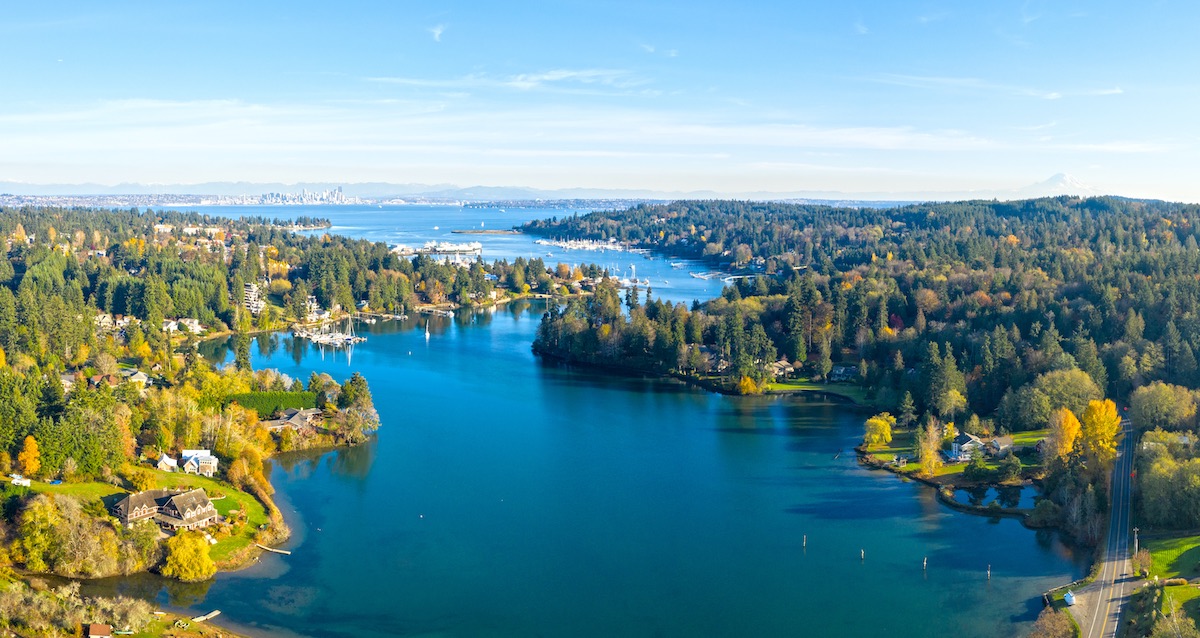 Bainbridge Island is a small city located west of Seattle in Puget Sound. It’s best known for its waterfront views, sandy beaches, scenic reserves, and sprawling mountain vistas hugging the coast.