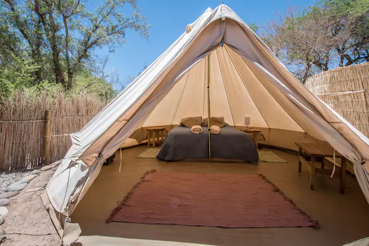 Next on our list of the best glamping sites in Chile is Atacama Loft & Glamp. Located within walking distance from San Pedro de Atacama, this stylish boutique glamping site offers extraordinary views of mountain ranges, swift service, and nicely furnished tents and lofts. These units are nestled in the shadows of endemic trees and come with comfy beds, nightstands, and shared bathrooms and kitchens. Some exclusive tents with private terraces have a capacity of up to 5 guests.