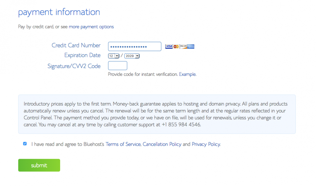After you’ve been blogging for a bit and build an audience, you can choose to upgrade as necessary, but when you’re just starting out the BlueHost Basic plan is more than enough.