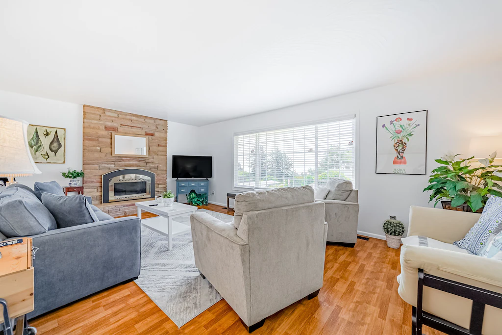 The fully stocked kitchen, complete with all major appliances and a Kitchen-Aid mixer, is simply stunning and you’ll find every excuse to spend time there. The living room with a fully functioning fireplace is perfect for cozying up in the evenings. Imagine waking up to stunning views of the Sandy River from the balcony of the Riverside Chalet and savoring your morning coffee to the gentle sound of the flowing water. And what about taking a stroll along the charming trail that runs alongside the river, a perfect activity any time of day, and the ideal spot for a picturesque picnic? Sounds like an amazing plan, right?