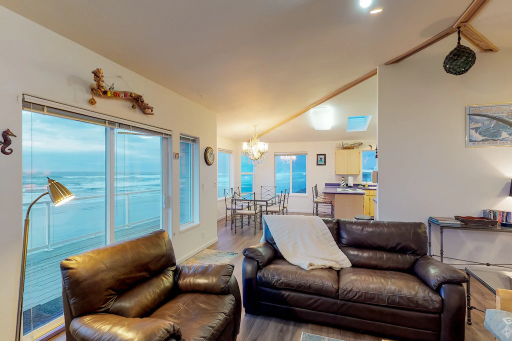 Step inside, and you’ll immediately be struck by the modern and stylish decor, complete with bamboo floors and travertine tiles in the bathroom. The house features two bedrooms, one bathroom, and a loft, all with breathtaking views of the beach. Each bedroom is equipped with a comfortable queen bed, storage drawers, and wardrobes, making it the perfect space for an extended stay. The downstairs great room is the perfect place to relax and unwind after a day of exploring the beautiful Oregon coast. Enjoy a meal with family or friends at the dining table, which seats six people, or curl up on the comfortable sofa.