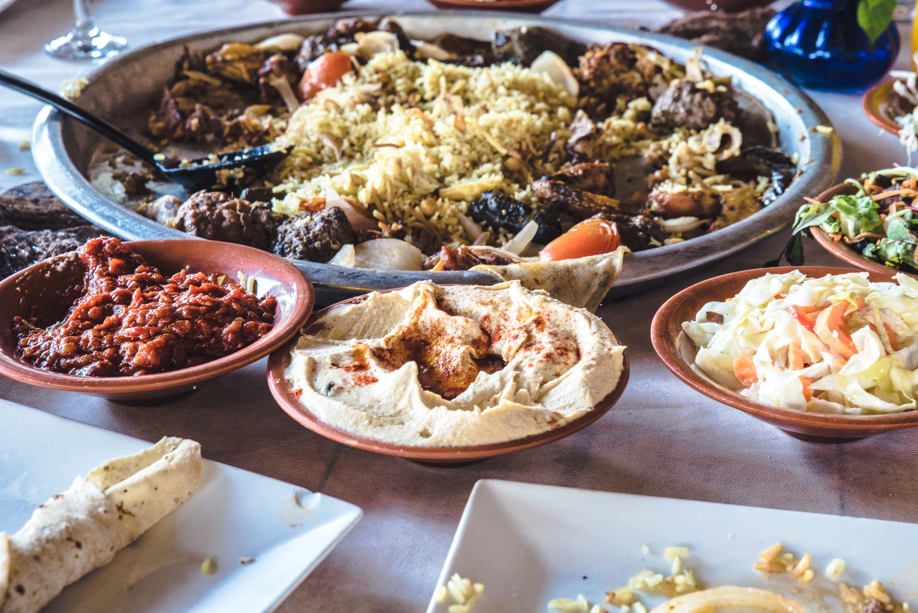 The sun is setting, camels are walking by, and we’re in an Oasis in Kana`im Valley in the Judean desert enjoying a massive meal!